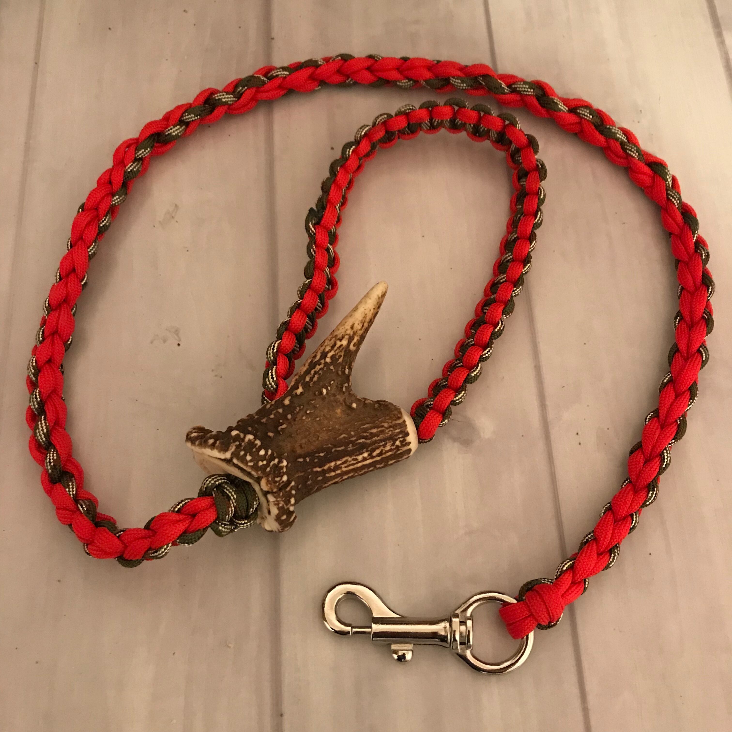 鹿の角を持ち手の分岐部分ににいれたパラコードのリードです!犬用の金具を使用しております。